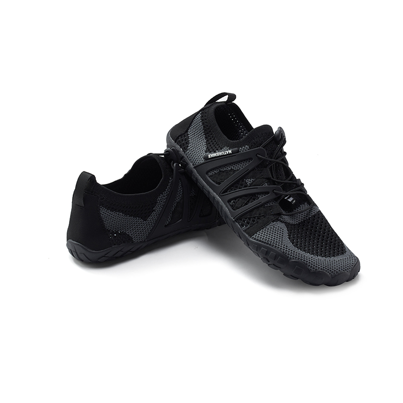 Sportovní obuv typu barefoot se vzorovanou protiskluzovou podrážkou a horním stahovacím jezdcem s gumičkou pro individuální nastavení velikosti nártu.