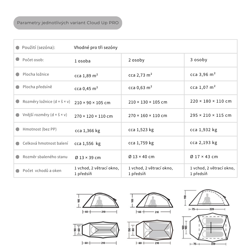 Nadále zůstávají všechny osvědčené přednosti – továrně podlepené švy, sestavení do 5 minut, spolehlivé dvojité zipy YKK, vnitřní síťované kapsy či háček na zavěšení světla.