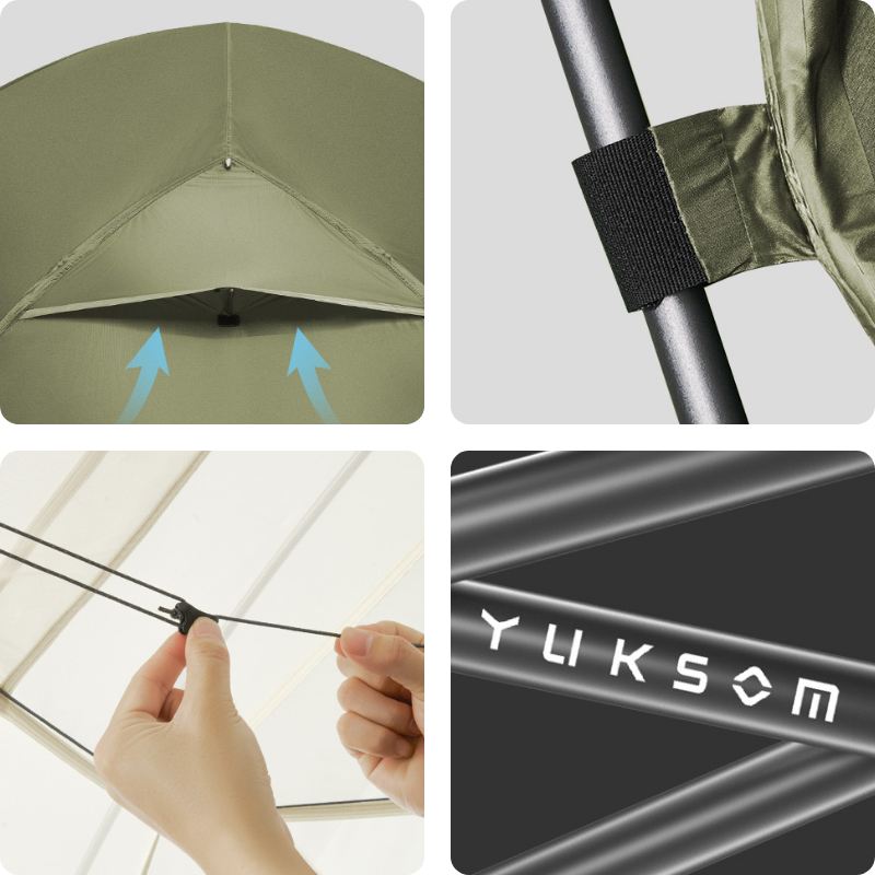 Samonosná konstrukce umožňuje postavení i tam, kde není možné stan plně vypnout kolíky, a zároveň usnadňuje manipulaci při stavbě.