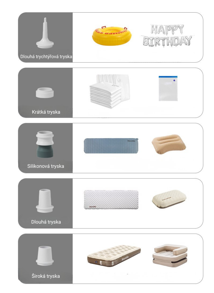 Vhodná pro nafukování cestovních polštářků, matrací, dětských nafukovacích hraček nebo například k rozfoukání ohně.