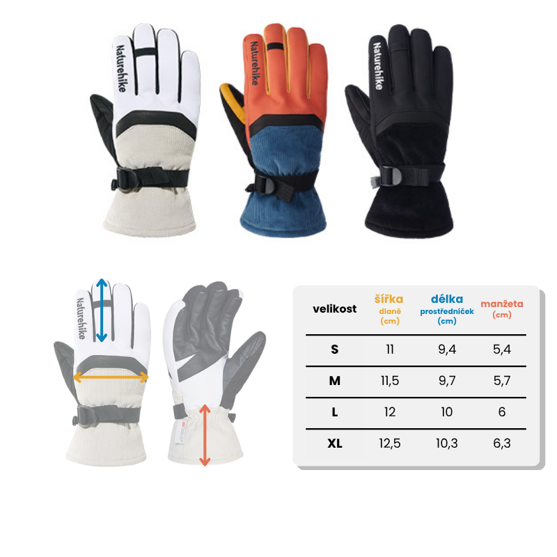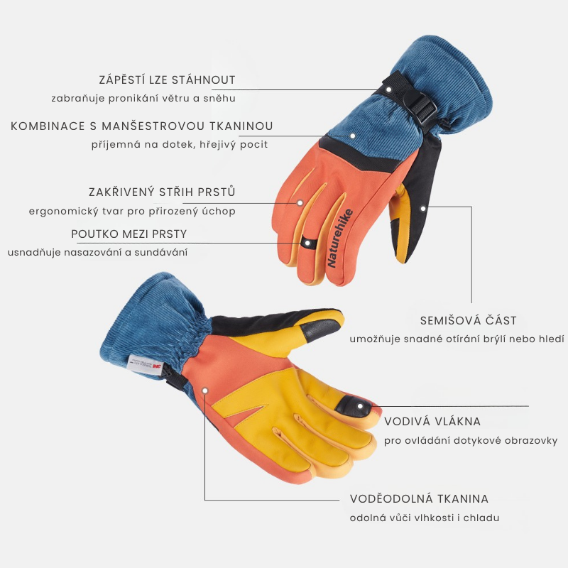 + Voděodolná PU membrána – chrání ruce před sněhem a větrem, zároveň zůstává prodyšná.